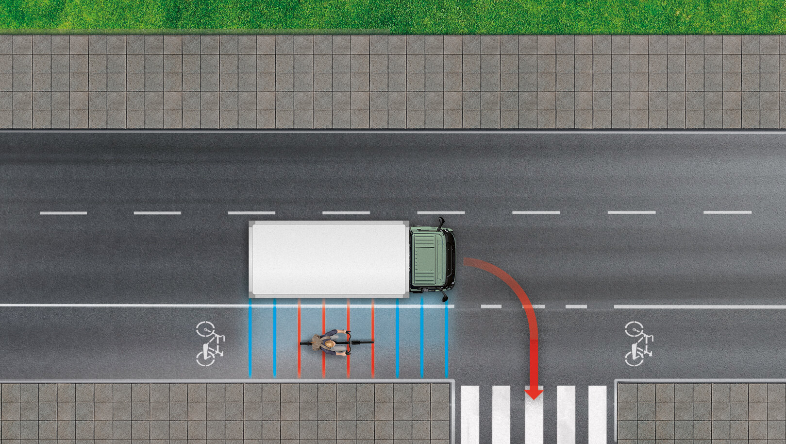 Das System erkennt Fußgänger und Radfahrer im vorderen toten Winkel des Fahrzeugs und warnt den Fahrer vor einer möglichen Kollision.